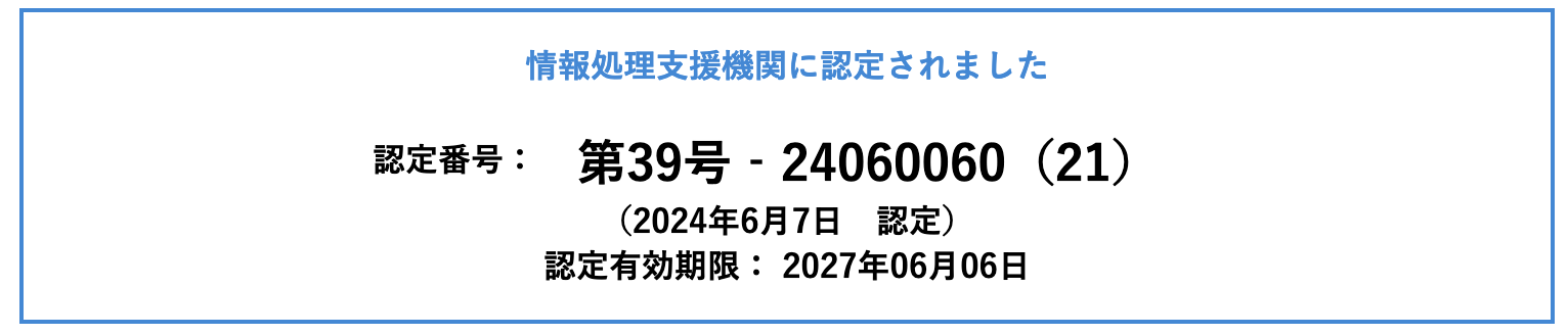 お知らせ 情報処理支援機関に認定されました 2024.06.07 情報処理支援機関に認定されました。 認定番号:第39号‐24060060(21) (2024年6月7日 認定) 認定有効期限: 2027年06月06日 詳しくはこちらから Post Share Hatena Pocket feedly Pin it 就労者が安心して 長く働ける場をつくる。発芽にんにく...