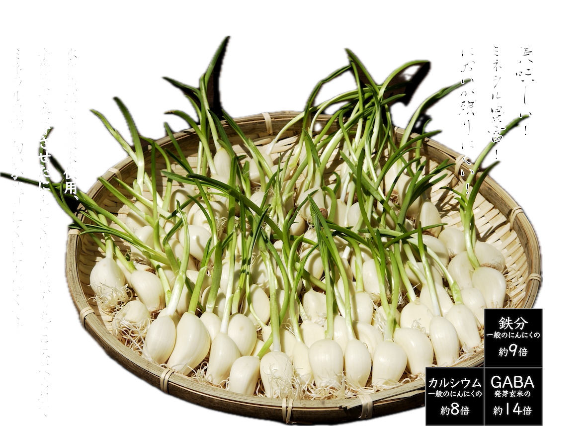 水の郷である設楽の水で育つ”にんにくぐらし”は水耕栽培で農薬未使用、手作業で発芽させております。